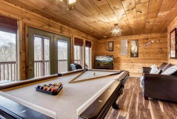 Venture outside onto the deck and immerse yourself in the fresh mountain air. Relax in the steaming hot tub while soaking in panoramic views of the Smokies, or unwind on one of the porch rockers and listen to the serene sounds of nature. For some friendly competition, head to the game room and challenge your companions to a thrilling game of pool. Experience the rustic charm of the log cabin with door latches on each bedroom door.