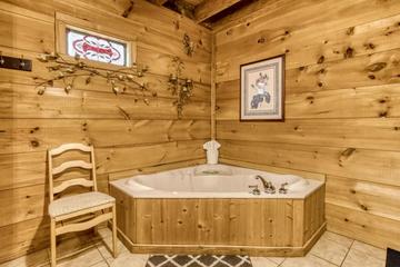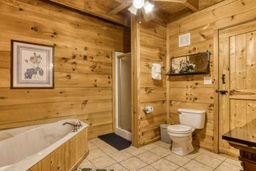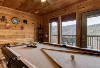 Venture outside onto the deck and immerse yourself in the fresh mountain air. Relax in the steaming hot tub while soaking in panoramic views of the Smokies, or unwind on one of the porch rockers and listen to the serene sounds of nature. For some friendly competition, head to the game room and challenge your companions to a thrilling game of pool. Experience the rustic charm of the log cabin with door latches on each bedroom door.