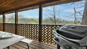 Large windows allow natural light to fill the space and bring the beauty of the outdoors inside, while the woodsy surroundings provide a sense of calm that enhances your stay.