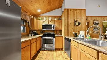 The kitchen at Home Sweet Home may not feature stainless steel appliances, but it has everything you need to prepare meals during your stay. Equipped with all the essentials—stove, oven, refrigerator, microwave, coffee maker, cookware, and dishes—you can easily whip up a hearty breakfast before heading out on adventures or return in the evening to cook dinner together as a family.