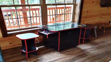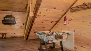 Descend to the lower level, where the fun truly begins. This level features a spacious game room that is sure to keep guests entertained for hours. The game room includes a pool table, a table-top arcade game, a foosball table, and a domino table for added entertainment. For extra sleeping accommodations, a sleeper sofa is also available, ensuring everyone can have a comfortable place to rest.