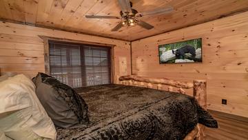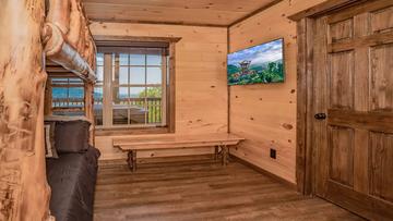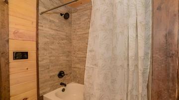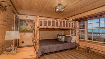 The lower level also includes three additional bedrooms, each offering its own unique amenities. The first bedroom on this level features a king-sized bed, a large HDTV, and a private en-suite bathroom with a soaking tub and a tiled shower. This room offers the perfect place to relax and unwind after a day of exploring the area, with its luxurious furnishings and serene atmosphere. The second bedroom also includes a king-sized bed and a large HDTV, and it shares a full bathroom (with a tub and shower) with the third bedroom. The third bedroom is ideal for families or groups, featuring a queen-over-queen bunk bed and a large HDTV for added convenience.