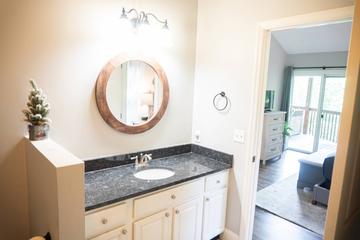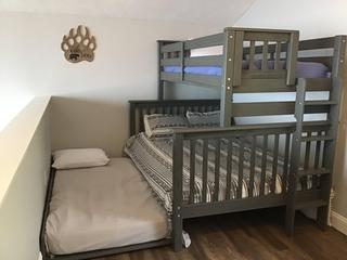 The open loft area adds versatility and fun to your stay. With a twin-over-full bunk bed with a twin trundle, this space is great for kids, teens, or additional guests. The loft also includes a TV and a foosball table, creating the perfect spot for family game nights or entertaining younger travelers.