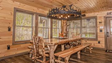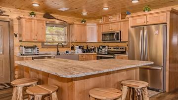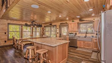 The main level of the cabin is designed with an open-concept living space that invites natural light to flood in, showcasing the beautiful surroundings. The living room is equipped with plush furniture, a large flat-screen Smart HDTV, and a Blu-Ray player for movie nights. The electric fireplace adds warmth and ambiance, while Wi-Fi and a Bluetooth wireless Fosi Audio system with built-in speakers provide convenience and entertainment for all guests. The kitchen is a chef’s dream, with stainless steel appliances, granite countertops, and a large island with seating for four. The dining area has ample space for everyone to gather and enjoy a meal together.