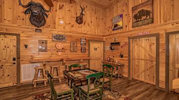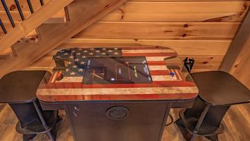 The lower level of Queen Bee is dedicated to entertainment, featuring a spacious game room that is sure to keep everyone entertained for hours. The game room has soaring 20-foot ceilings, creating an open and airy atmosphere. It is equipped with a pool table, a multi-player arcade game, and a dominoes game table for even more fun. A large flat-screen HDTV, electric fireplace, and a bar-top with stools offer a cozy yet exciting environment, perfect for unwinding after a day of adventure. The game room also includes a coffee maker, so you can brew a fresh cup of coffee before heading out to the deck.