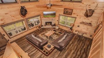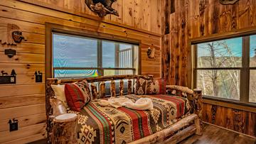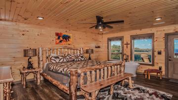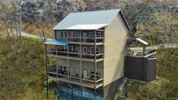 This three-story log cabin boasts incredible panoramic views of the mountains and city below, making it the perfect retreat for anyone looking to unwind and enjoy the beauty of the Smokies. The cabin features five spacious bedrooms, with the fifth being an open loft space that offers a unique and cozy atmosphere for guests. There is plenty of parking available for up to five cars, ensuring that everyone can enjoy a comfortable stay.