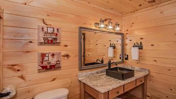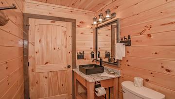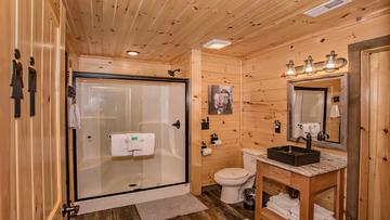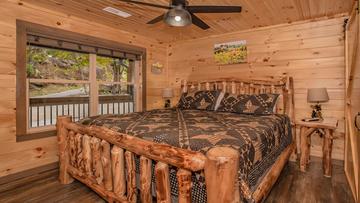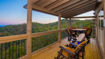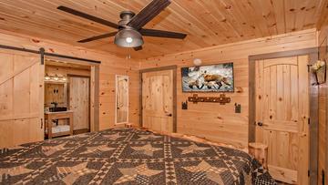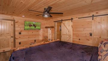 On this level, two of the five bedrooms feature luxurious king beds and access to a full Jack and Jill bathroom with a shower. One of these bedrooms has direct access to the deck, where you can step outside and take in the stunning views of the surrounding mountains. The back deck is spacious, offering plenty of seating where you can relax, enjoy your morning coffee, or watch the sun set over the Smoky Mountains. There is also a look-out deck on the side of the cabin, providing an additional space to take in the scenery.
