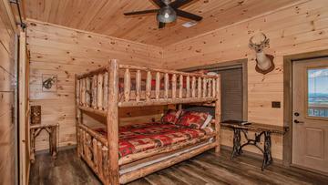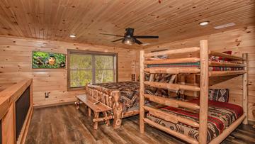 The lower level also includes a bedroom with a queen-over-queen bunk bed, a large flat-screen HDTV, and a full bathroom with a shower. This bedroom shares the bathroom with the game room, making it convenient for all guests to enjoy. After a fun-filled day, step out onto the covered deck to relax in the eight-person hot tub while taking in the picturesque mountain views.