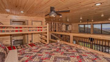 On the upper level, you’ll find a private master bedroom that is designed to offer a restful retreat. This room features a king-size bed, a large flat-screen TV, and an electric fireplace for added comfort. The attached bathroom is a luxurious oasis, complete with a tiled shower and a large soaking tub where you can unwind after a day of exploring. The master bedroom also has a private covered deck with seating, perfect for enjoying a quiet moment alone while overlooking the incredible mountain views. In addition to the master bedroom, the upper level has an open loft bedroom, ideal for families or groups. This unique open-concept space includes a king bed, a twin-over-twin bunk bed, and a large flat-screen HDTV, making it a perfect spot for kids or guests who enjoy a little more space. The loft also includes a convenient half-bathroom.