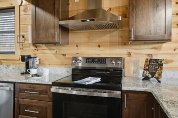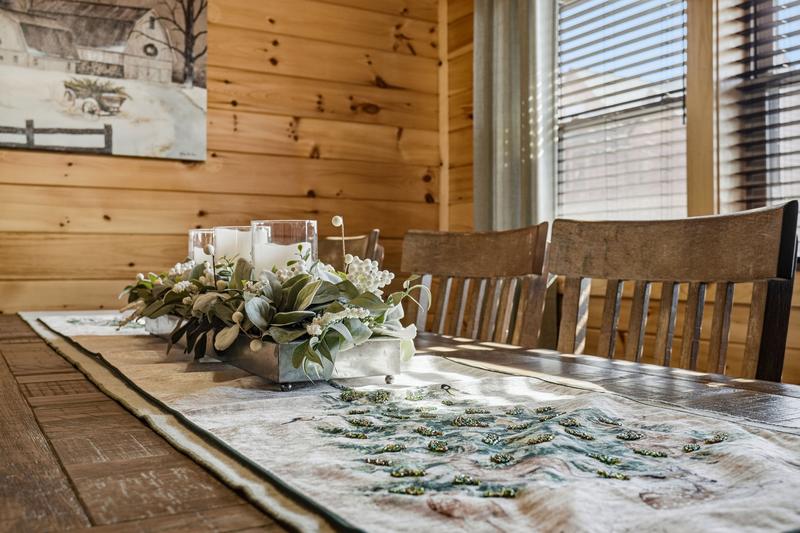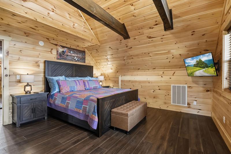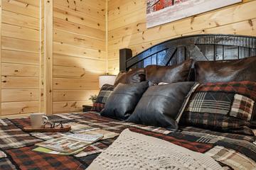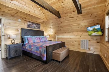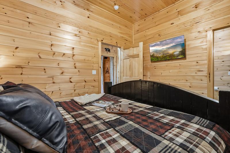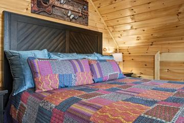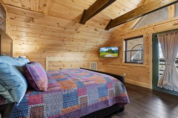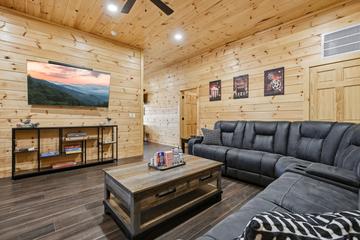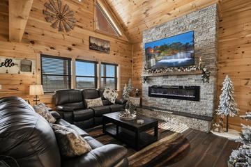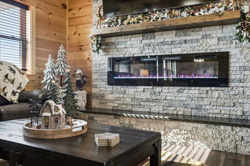Inside the cabin, you'll find a thoughtfully designed space that blends entertainment and comfort. The living room is warm and inviting, anchored by a color-changing electric fireplace that lets you set the mood with the touch of a button. It’s a great spot for cozying up during the cooler months, watching a movie on the flat-screen smart TV, or simply spending quality time with your loved ones. All TVs throughout the cabin are flat-screen smart TVs, so you’ll never miss your favorite shows or streaming services no matter where you are in the cabin.