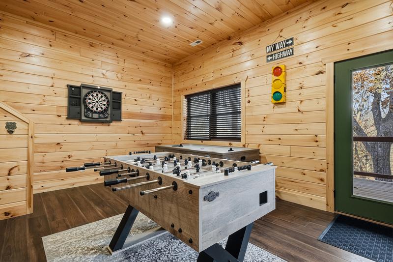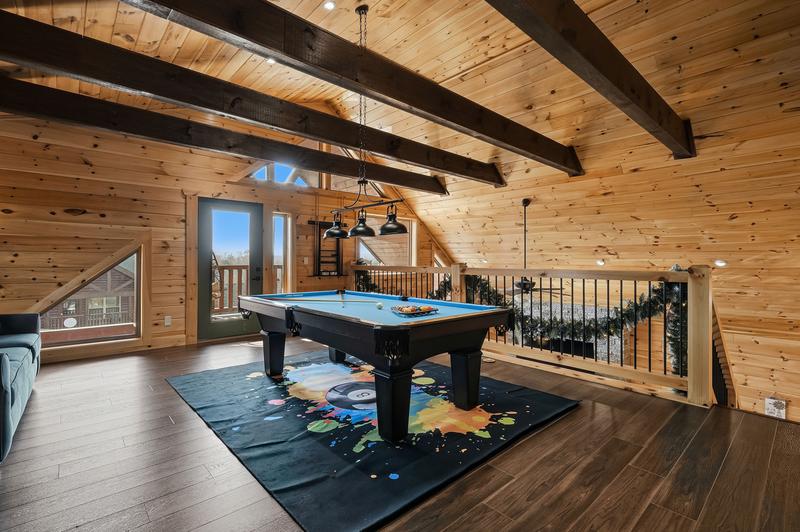 The game room is a highlight for guests of all ages, featuring a foosball table and an air hockey table that are sure to spark a little friendly competition. Whether you're looking for a way to entertain the kids or unwind yourself, the game room offers hours of indoor fun. Upstairs in the loft, you'll find a pool table and two sleeper sofas, making this space great for entertaining or accommodating extra guests.
