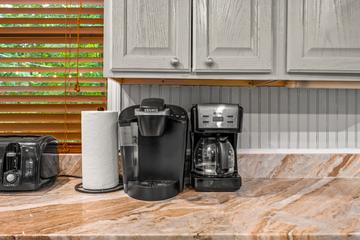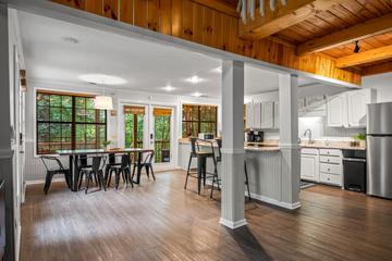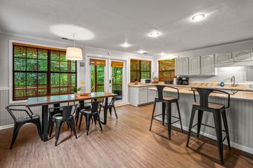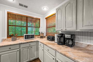 The fully equipped kitchen is a highlight, featuring stainless steel appliances and sleek granite countertops. Whether you prefer cooking full meals or simply reheating leftovers from Pigeon Forge’s many restaurants, this kitchen provides everything you need. There’s abundant counter space for prepping meals and plenty of storage for snacks and ingredients. The adjacent dining area offers ample room for shared meals, game nights, or morning coffee while overlooking the wooded surroundings.