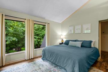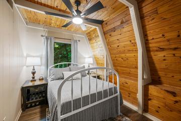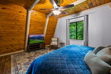 The living area is warm, inviting, and perfectly designed for gathering. A beautiful stone fireplace enhances the mountain-cabin atmosphere, making chilly nights feel extra special. Kick back on the comfortable seating, stream your favorite movies, or simply enjoy the natural light that pours in through the A-Frame windows. This shared space allows everyone to relax together while still offering plenty of room to spread out.